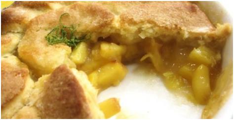 Em uma tigela, coloque os pêssegos descascados e cortados em cubos, suco de limão, açúcar, sal, sumo de gengibre fresco polvilho doce e creme de leite fresco misture bem. Coloque esta mistura numa fôrma (24 cm de diâmetros) e reserve.